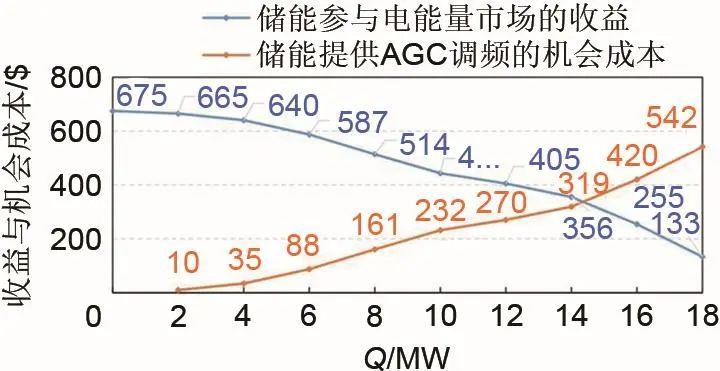 式中,圖片表示儲能提供一定容量調頻容量的機會成本,圖片表示儲能不提供調頻服務時在電能量市場中的收益,圖片儲能提供一定容量調頻容量后在電能量市場中的收益。