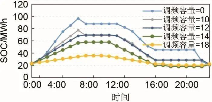 鋰電池儲能系統提供不同AGC調頻容量時,其荷電狀態(tài)變化趨勢如圖5所示。儲能系統通過充放電參與電能量市場,獲取收益。因此,荷電狀態(tài)的變化程度也可反映其在電能量市場中的收益情況。調頻容量為0,即儲能系統只參與電能量市場時,儲能系統在電能量市場收益最大,最大荷電狀態(tài)接近100 MWh,最小值接近22 MWh;而當調頻容量增大到10 MW時,儲能系統最多儲存的電量不到80 MWh;當調頻容量增大到12 MW時,儲能系統最多儲存的電量不到70 MWh,儲能系統在電能量市場中的利用情況進一步降低;當調頻容量增大到18 MW時,儲能系統的荷電狀態(tài)變化范圍為20~40 MWh,在電能量市場中的收益變得更小。當系統儲能提供AGC容量較大時,儲能系統的荷電狀態(tài)離上限范圍較大,即為松弛約束。然而,功率容量是限制儲能系統提供AGC獲利的主要因素。