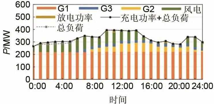 圖4中,三個常規(guī)機組總出力是6106.89 MWh,風電出力是1471.2 MWh,儲能總充電功率為68.82 MWh,放電功率為61.94 MWh。利用峰谷電價差進行充放電的總收益為1199元,總運行成本524元,因此儲能在電能量市場中的凈收益為675元。