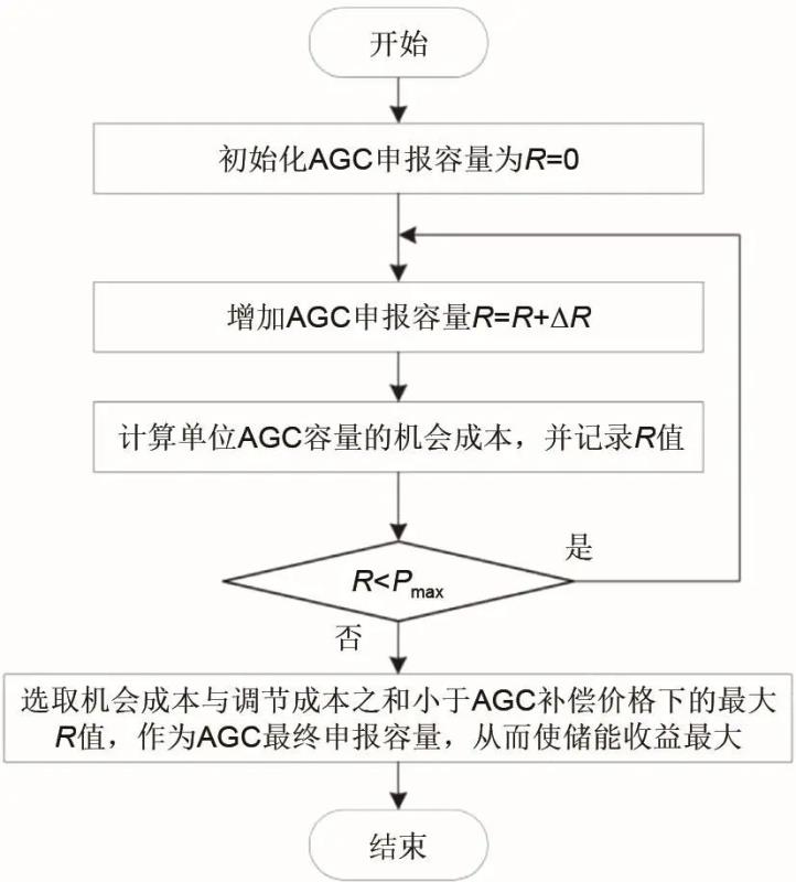值得注意的是,如果儲能系統的容量相對于整個電力系統來說很小,則其對電能量市場出清電價的影響可以忽略不計。本研究將逐次計算鋰電池儲能提供不同AGC調頻容量下的機會成本,然后根據AGC機會成本、AGC調節(jié)成本之和與AGC補償價格的大小,做出參與電能量市場和輔助服務市場的決策。只要單位AGC容量的機會成本與AGC調節(jié)成本之和小于AGC補償價格,儲能系統就可以通過參與AGC市場獲得更多收益。因此,選取機會成本小于AGC補償價格下的最大AGC可申報容量,作為最優(yōu)決策,該市場策略的流程如圖1所示。