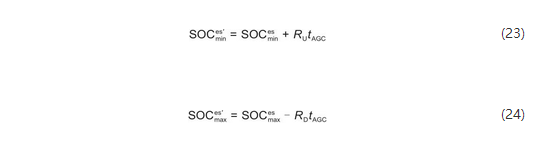 鋰電池儲能系統可以同時參與電能量市場和輔助服務市場,需要預留出一部分容量,以備AGC的調用,而儲能一般有荷電狀態(tài)上、下限的約束,所以儲能除了要預留功率容量外,還需預留電量裕度,即荷電狀態(tài)的上、下限: