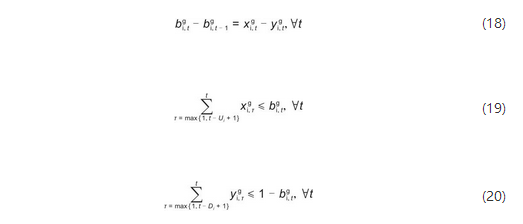 式(15)~(20)中,圖片表示機組的運行狀態(tài)變量;圖片、圖片為機組的最大、最小技術出力;圖片、圖片分別為機組的最大向上、向下爬坡速率;圖片、圖片分別表示機組的開機、停機狀態(tài)變量;圖片、圖片為機組的最小開、停機時間。
