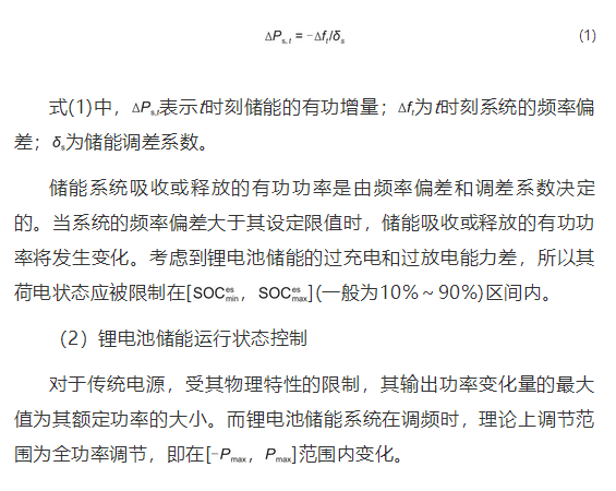 鋰電池儲能系統響應電力系統頻率偏差的控制方法中,有功-頻率下垂控制是較為常用的控制方法之一,其有功增量與頻率偏差滿足如下關系: