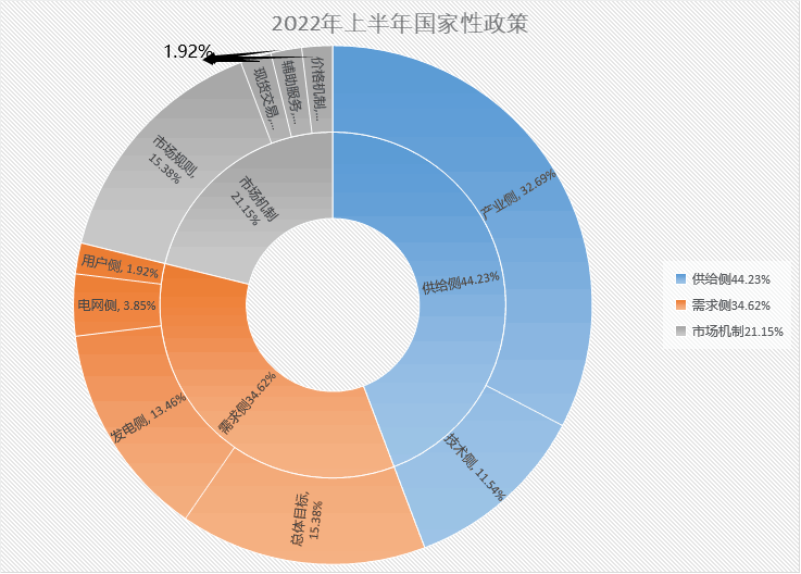 2022年上半年,共發(fā)布國(guó)家性政策52項(xiàng),供給側(cè)相關(guān)政策共23項(xiàng),其中產(chǎn)業(yè)側(cè)相關(guān)政策占比居多,共17個(gè),鼓勵(lì)技術(shù)側(cè)發(fā)展的政策有6項(xiàng);需求側(cè)政策18項(xiàng),市場(chǎng)機(jī)制相關(guān)政策11項(xiàng)。