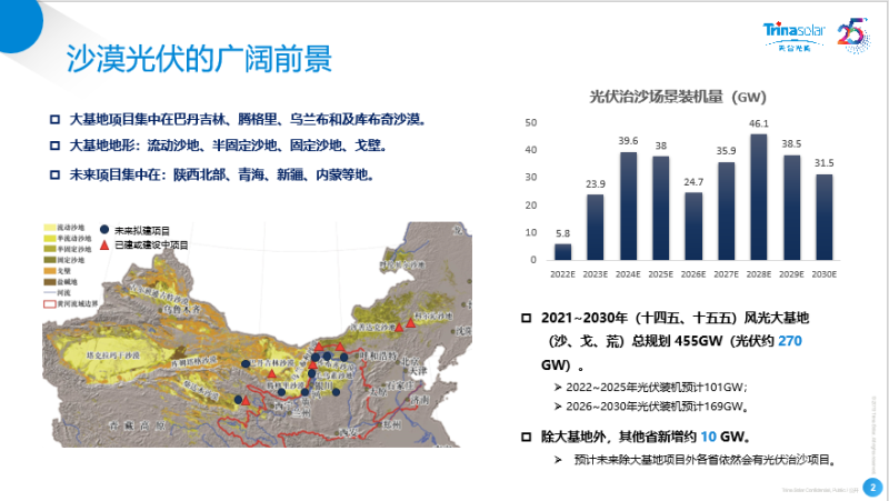 可以預(yù)見(jiàn)的是,在不斷出臺(tái)的利好政策,持穩(wěn)增長(zhǎng)的市場(chǎng)需求以及加速發(fā)展的綠色變革的引領(lǐng)下,光伏大基地項(xiàng)目逐漸成為各省“十四五”規(guī)劃的主流模式之一,大基地項(xiàng)目的發(fā)展帶來(lái)了更多的應(yīng)用場(chǎng)景與發(fā)展模式。作為大基地多場(chǎng)景解決方案領(lǐng)軍者,天合光能因地制宜,致力于在光伏系統(tǒng)解決方案發(fā)展進(jìn)步的篇章中提供更優(yōu)質(zhì)的服務(wù)。