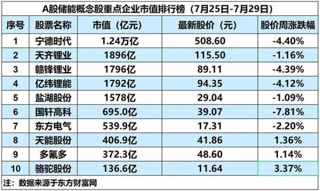 中國儲能網(wǎng)訊:本周(7月25日—7月29日),東方財富儲能概念板塊繼續(xù)延續(xù)漲勢,板塊除在周一出現(xiàn)回調(diào)外,其余四個交易日均放量上漲?!度A夏時報》記者重點監(jiān)測的10家儲能企業(yè)中,有7家下跌,3家上漲。其中駱駝股份和天能股份的漲幅最高,分別為3.37%和1.36%。