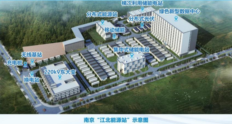 南京“江北能源站”位于江北新區(qū)醫(yī)藥谷片區(qū),占地68畝,是國內首座集合220千伏變電站、大規(guī)模集中式儲能、梯次利用儲能、分布式能源站、綠色新型數(shù)據(jù)中心、無線基站等十大元素的 “多站融合”能源綜合服務站。