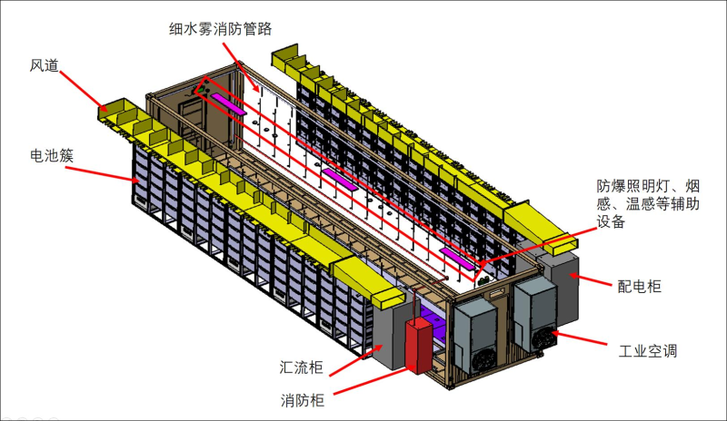 一級防護:電池艙內實時監(jiān)測、快速動作。預制艙內設置高靈敏度的火災報警系統(tǒng),配備可燃氣體探測器、溫感、煙感探測器。儲能系統(tǒng)艙內消防采用細水霧滅火系統(tǒng)和全淹沒式七氟丙烷氣體滅火系統(tǒng),并將兩種消防設施與艙內BMS系統(tǒng)及配備的煙感、溫感、可燃氣體滅火器進行聯(lián)動,實現(xiàn)在發(fā)生火災時第一時間進行動作,將事故消滅在最初階段。
