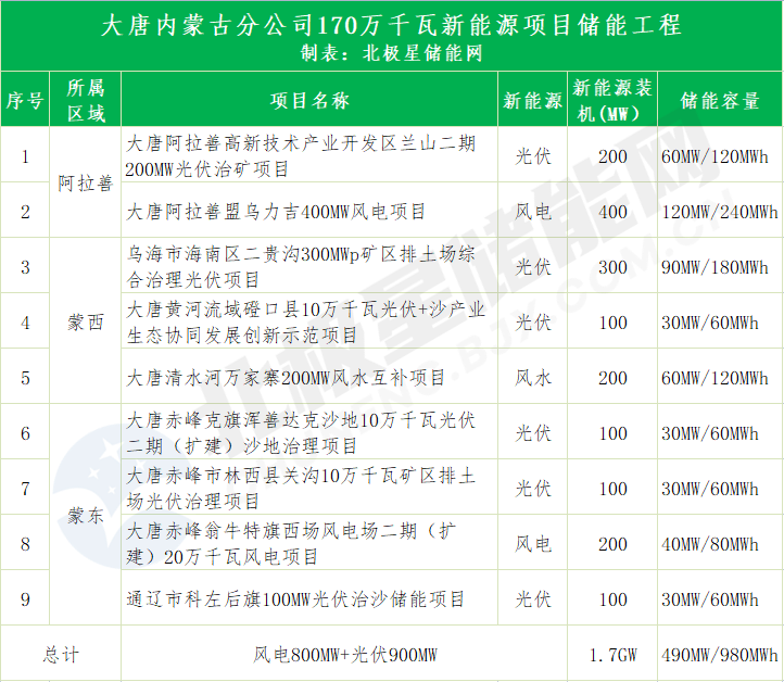 蒙東區(qū)域標段:包括大唐赤峰克旗渾善達克沙地10萬千瓦光伏二期(擴建)沙地治理項目,配套儲能容量30MW/60MWh,大唐赤峰市林西縣關(guān)溝10萬千瓦礦區(qū)排土場光伏治理項目,配套儲能容量30MW/60MWh,大唐赤峰翁牛特旗西場風電場二期(擴建)20萬千瓦風電項目,配套儲能容量40MW/80MWh,通遼市科左后旗100MW光伏治沙儲能項目,配套儲能容量30MW/60MWh,四個項目合計配套儲能容量為130MW/260MWh。