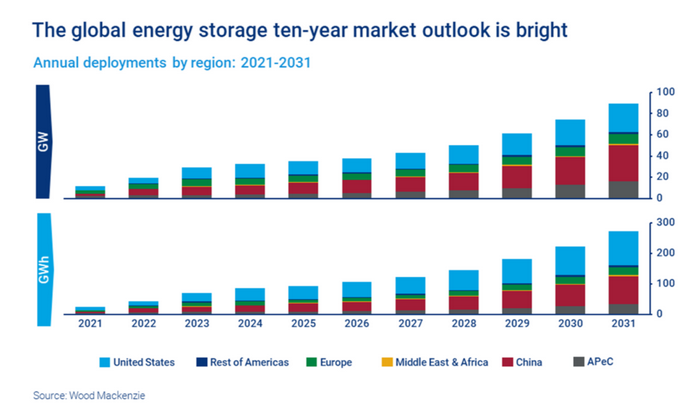該公司在最新一期的“全球儲(chǔ)能市場(chǎng)展望更新”季度版報(bào)告是指出,到2031年,全球儲(chǔ)能市場(chǎng)累計(jì)部署的儲(chǔ)能系統(tǒng)總裝機(jī)容量將達(dá)到500GW,其中美國(guó)和中國(guó)占到75%。