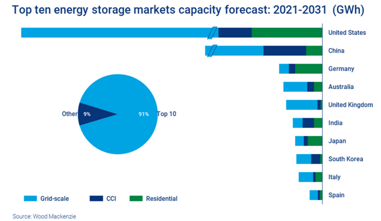 如下圖所示,美國(guó)和中國(guó)將在2021~2031年主導(dǎo)全球儲(chǔ)能市場(chǎng),而全球十大市場(chǎng)將占同期新增儲(chǔ)能容量的91%。在德國(guó)、印度和日本以外的大多數(shù)國(guó)家和地區(qū),電網(wǎng)規(guī)模儲(chǔ)能系統(tǒng)將是增長(zhǎng)的最主要的部分,其中住宅和商業(yè)和工業(yè)(C&I)的儲(chǔ)能系統(tǒng)將占大部分。
