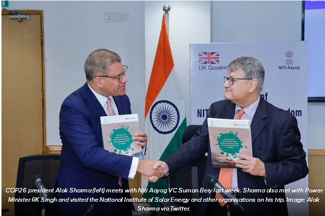 上周,英國(guó)政治家、COP26大會(huì)主席Alok Sharma會(huì)見(jiàn)了印度國(guó)家研究院(NITI Aayog)首席執(zhí)行官Parameswayan Iyer及其副院長(zhǎng)Suman Bery,討論英國(guó)和印度在電動(dòng)汽車以及電池市場(chǎng)的再利用和回收方面的合作。