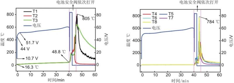 電壓方面,第一階段,由于該電池組試樣前期做了過放電的試驗(yàn),電池組狀態(tài)不同于正常的電池組。此時(shí),電池組內(nèi)的電池由于過放造成了內(nèi)部電化學(xué)體系的破壞,導(dǎo)致電池歐姆內(nèi)阻提高,使得電池組的歐姆電阻(1.23 Ω)大于常規(guī)電池組的歐姆電阻(毫歐級別),所以,在恒流充電的瞬間,電池組電壓明顯上升,從10.7 V到了44 V。在40 min之前,電池組首先從過放電狀態(tài)轉(zhuǎn)變?yōu)闈M電態(tài),此時(shí)電池組電壓表現(xiàn)平穩(wěn),幅度相對較小,然后從滿電態(tài)轉(zhuǎn)變?yōu)檫^充電狀態(tài),此時(shí)電壓明顯上升,幅度逐漸變大。第二階段在實(shí)驗(yàn)進(jìn)行40 min以后,電池組電壓開始劇烈波動,最低電壓接近20 V,這表明電池內(nèi)部結(jié)構(gòu)已經(jīng)發(fā)生顯著變化,電池發(fā)生部分內(nèi)短路,釋放大量熱量,電池內(nèi)部壓力迅速提高,導(dǎo)致泄壓閥打開。而后電池完全內(nèi)短路,電壓為0 V,溫度進(jìn)一步升高,電池?zé)崾Э亍?