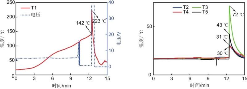 在室溫條件下,以27 A(2 C)電流對單體電池進(jìn)行恒流過充,最高電壓上限設(shè)置為10倍額定電壓(37 V)。當(dāng)電池達(dá)到充電限制電壓時(shí),改為恒壓充電,直到電池發(fā)生爆炸或燃燒。