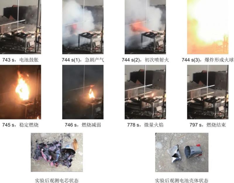 鋰離子單體電池過充實(shí)驗(yàn)現(xiàn)象見圖4。實(shí)驗(yàn)過程可大致分為3個階段:第一階段為電池殼體鼓脹變形階段,從實(shí)驗(yàn)開始至743 s時(shí)可見電池殼體變形,電池試樣周邊散逸少量白色煙氣。這一階段,過充僅導(dǎo)致電池內(nèi)部材料發(fā)生各類反應(yīng)并產(chǎn)生一定的氣體,電池殼體內(nèi)部壓力增大導(dǎo)致電池出現(xiàn)外觀鼓脹變形。少量白色煙氣的產(chǎn)生主要是因?yàn)殡S著電池過充釋放出一定的熱量,導(dǎo)致電池外殼及不燃隔熱材料等產(chǎn)生熱分解。第二階段射流火及爆炸階段,持續(xù)時(shí)間僅為1 s。實(shí)驗(yàn)進(jìn)行至744 s時(shí)安全閥打開,在1 s時(shí)間內(nèi)電池釋放大量白色煙氣、急劇噴射火焰并瞬時(shí)發(fā)生爆炸,形成巨大火球。由于實(shí)驗(yàn)最高電壓上限設(shè)置為10倍額定電壓(37 V),在較高的截止電壓過充下,電解質(zhì)、電極以及集流體的電阻顯著增大,電池動力學(xué)性能及熱穩(wěn)定性顯著降低,內(nèi)部化學(xué)反應(yīng)增強(qiáng)。隨著持續(xù)過充電池內(nèi)部反應(yīng)的加劇,產(chǎn)氣量不斷增大導(dǎo)致電池內(nèi)部壓力也急劇增大,僅安全閥破裂泄壓難以實(shí)現(xiàn)電池內(nèi)部和外部的平衡,因而發(fā)生電池殼體撕裂出現(xiàn)爆炸。電池內(nèi)部熱失控反應(yīng)產(chǎn)生的可燃?xì)怏w和電解液與空氣混合后被引燃,形成初次射流火并伴隨著爆炸形成了強(qiáng)烈的火球。第三階段為穩(wěn)定燃燒階段,爆炸后能量得到泄放,支架上電池內(nèi)部殘余的電解液及可燃材料仍持續(xù)猛烈燃燒,火焰持續(xù)53 s后完全熄滅。實(shí)驗(yàn)后觀測圖片可見,電芯中銅箔和鋁箔表面的所有物質(zhì)均已過火,電池爆裂位置并未發(fā)生在安全閥附近,而是在位于電池殼體約1/3處完全撕裂,進(jìn)一步表明爆炸瞬間安全閥的破裂不足以實(shí)現(xiàn)電池殼體內(nèi)外壓力平衡,在744 s時(shí)電池內(nèi)部產(chǎn)氣壓力大大超過了安全閥設(shè)定的閾值。