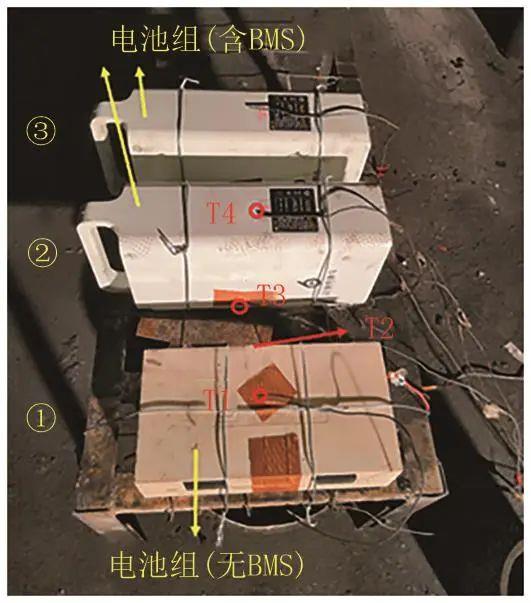 為了考察多個鋰離子電池組在一定間距下相互引燃的情況,采用3個鋰離子電池組在間距6.5 cm的條件下開展實(shí)驗(yàn),布置如圖3所示。實(shí)驗(yàn)時(shí)將3個電池組放置于鐵支架上,其中1號不帶BMS的電池組水平放置,安全閥方向朝向2號電池組,2號、3號電池組側(cè)立放置,安全閥方向朝上。采用4支熱電偶測量電池表面溫度及煙氣、火焰溫度。實(shí)驗(yàn)仍在爆炸洞內(nèi)完成,在室溫條件下,以27 A(2 C)電流對1號鋰離子電池組進(jìn)行恒流過充,最高電壓上限設(shè)置為80 V。