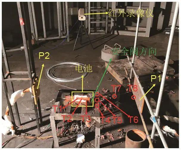 實(shí)驗(yàn)現(xiàn)場選擇在爆炸洞內(nèi),將樣品電池采用水平放置的方式,放置在距地面50 cm的支架上,如圖1所示。電池兩側(cè)采用夾具固定,并采用一定厚度的隔熱棉隔離電池和支架以減少熱量損失。在爆炸洞外,用計(jì)算機(jī)程序遠(yuǎn)程控制IT6522A型充放電儀(南京艾德克斯公司)測試系統(tǒng)對樣品電池做過充測試,記錄其電流電壓隨時(shí)間的變化情況。在爆炸洞外觀察孔處布置一架APX RX型高速攝影儀(日本Photron公司),記錄樣品電池的爆炸過程。采用5支直徑為2 cm、量程范圍為0~1200 ℃的K型鎧裝熱電偶(T1~T5)測量電池表面、煙氣及火焰溫度,其中T1位于電池表面中心位置;T2、T3、T4與電池上表面的距離均為5 cm;T5距離電池上表面15 cm。在距離電池安全閥約45 cm處布置2個211B6型壓力傳感器(瑞士KISTLER公司,P1~P2),測定樣品電池?zé)崾Э睾螽a(chǎn)生的壓力波。
