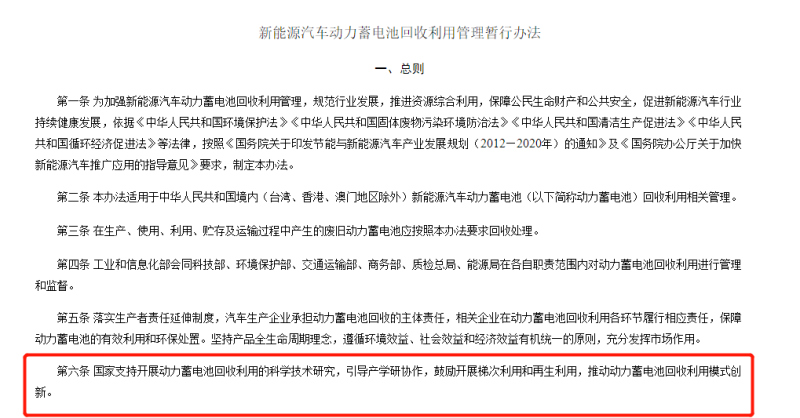 2018年,工信部等七部門曾聯(lián)合印發(fā)《新能源汽車動力蓄電池回收利用管理暫行辦法》,強調(diào)了對動力電池的梯次利用、回收網(wǎng)點建設(shè),并提出汽車生產(chǎn)企業(yè)承擔(dān)動力蓄電池回收的主體責(zé)任,但究竟如何落實等并沒有相關(guān)條款,工信部正在研究制定的《新能源汽車動力蓄電池回收利用管理辦法》或許會重點關(guān)注這些方面。
