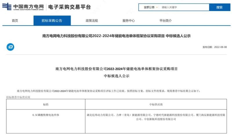 中國(guó)儲(chǔ)能網(wǎng)訊:8月8日,南方電網(wǎng)電力科技股份有限公司發(fā)布2022-2024年儲(chǔ)能電池單體框架協(xié)議采購(gòu)項(xiàng)目中標(biāo)候選人公示,廈門(mén)海辰新能源科技有限公司(簡(jiǎn)稱(chēng)“海辰儲(chǔ)能”)等五家企業(yè)成功入圍中標(biāo)候選人名單。