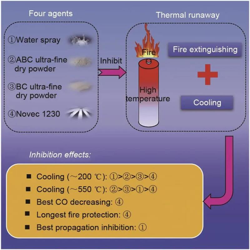 Liu等開發(fā)了一種滅火和快速冷卻的一體化的消防技術(shù)。先用全氟己酮熄滅電池明火,然后利用細(xì)水霧進(jìn)行降溫,電池未出現(xiàn)復(fù)燃,而未用細(xì)水霧持續(xù)降溫的電池則出現(xiàn)了復(fù)燃。此種二次滅火技術(shù)的有效性在于,先熄滅氣體火災(zāi),后進(jìn)行冷卻降溫。實(shí)驗(yàn)同時(shí)也證明了鋰離子電池火災(zāi)是能維持持續(xù)高溫的氣體火災(zāi),因此應(yīng)著重關(guān)注高效的氣體滅火劑和持續(xù)冷卻降溫劑這兩種滅火介質(zhì)的開發(fā)。