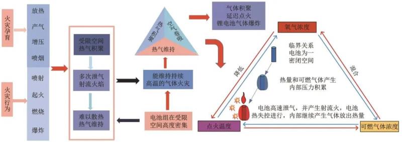 儲(chǔ)能電站鋰離子電池電池簇在單預(yù)制倉(cāng)儲(chǔ)室內(nèi)排列緊密,電池簇內(nèi)的電池高度密集,很容易形成熱失控?cái)U(kuò)展蔓延的情況,此時(shí)難以散熱,熱量和可燃?xì)怏w會(huì)慢慢積累;若可燃?xì)怏w擴(kuò)散、運(yùn)移后在受限空間積聚,則很容易在延遲點(diǎn)火后發(fā)生爆炸。因此,電池燃燒火災(zāi)是能維持高溫的氣體火災(zāi)。從電池化學(xué)體系和熱失控自生熱特性來(lái)看,電池火災(zāi)是含能材料自反應(yīng)的熱氣致燃?;谇笆龅臒崾Э匮莼^程3個(gè)階段和6個(gè)過程采取針對(duì)性防控措施非常關(guān)鍵。