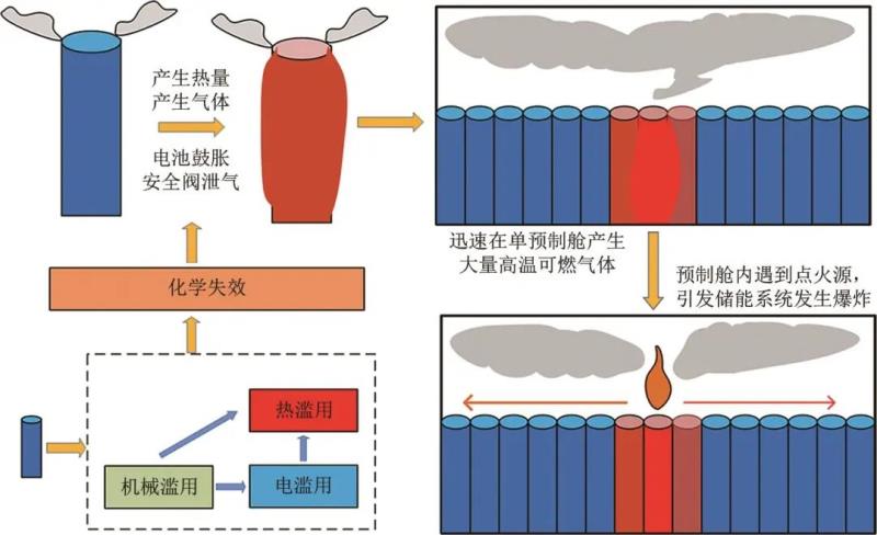 儲(chǔ)能電站鋰離子電池的火災(zāi)爆炸事故,主要是電池單體發(fā)生內(nèi)短路后使得電池?zé)崾Э仄鸹鹑紵?,進(jìn)一步熱失控?cái)U(kuò)展到相鄰電池,從而形成大規(guī)模火災(zāi),在受限空間中氣體積聚到一定程度時(shí),遇到點(diǎn)火源,又會(huì)發(fā)生爆炸。盡管鋰離子電池存在自引發(fā)內(nèi)短路致使熱失控的風(fēng)險(xiǎn),但是概率很低,僅為百萬(wàn)分之一。一般認(rèn)為,熱失控是在外部誘發(fā)條件如熱濫用、電濫用、機(jī)械濫用下造成的。儲(chǔ)能電站鋰離子電池發(fā)生熱失控時(shí),電池間會(huì)發(fā)生熱失控蔓延,進(jìn)一步引發(fā)大規(guī)模的電池燃燒,如圖1所示。