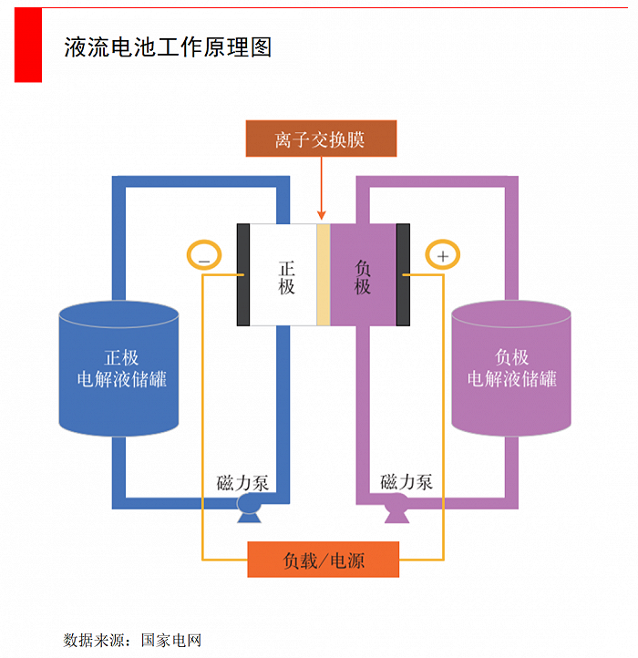對(duì)于釩液流電池,則是更遠(yuǎn)期的研發(fā)目標(biāo)。釩液流電池的技術(shù)路徑完全不同于鋰離子、鈉離子電池,而是與氫燃料電池原理類似,它是一種活性物質(zhì)呈循環(huán)流動(dòng)液態(tài)的氧化還原電池,它的工作原理是通過(guò)釩化合價(jià)的變化,來(lái)實(shí)現(xiàn)電能與化學(xué)能之間的轉(zhuǎn)化。
