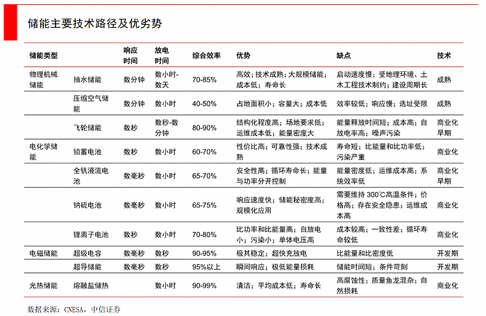 雖然儲(chǔ)能技術(shù)路徑眾多,但除了抽水蓄能與電化學(xué)儲(chǔ)能外,其他路徑無(wú)論在成本還是技術(shù)成熟度上,都還不足以大規(guī)模商業(yè)化,很多仍處于小規(guī)模實(shí)驗(yàn)性階段。