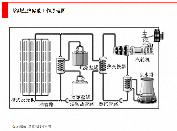 熔融鹽儲(chǔ)能:目前占比還很小。熔融鹽是將鹽升溫到熔點(diǎn)之后,形成的一種熔融態(tài)液體,基本都是由無(wú)機(jī)鹽構(gòu)成的熔融體。工作原理是將多余電能,把熔鹽的溫度增至500 ℃,再存貯至高溫熔鹽罐中,到用電高峰再把高溫熔鹽從罐內(nèi)取出,在熔鹽換熱器內(nèi)實(shí)現(xiàn)熱量轉(zhuǎn)換來(lái)對(duì)水與空氣進(jìn)行加熱,釋放熱能進(jìn)行使用。與過(guò)去的高溫導(dǎo)熱介質(zhì)相比,熔融鹽的高溫穩(wěn)定性比較好。這種方式主要用于冬季供暖。
