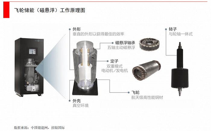飛輪儲(chǔ)能:目前是一個(gè)研究重點(diǎn),但應(yīng)用場(chǎng)景較小。飛輪儲(chǔ)能是通過(guò)低摩擦環(huán)境中,高速旋轉(zhuǎn)的轉(zhuǎn)子來(lái)存儲(chǔ)動(dòng)能。在“充電”時(shí),電動(dòng)機(jī)會(huì)發(fā)動(dòng)將飛輪加速,將電能轉(zhuǎn)化為機(jī)械能儲(chǔ)存;當(dāng)需要用電時(shí),飛輪轉(zhuǎn)速下降,透過(guò)發(fā)電機(jī)將機(jī)械能轉(zhuǎn)化為電能給外部供電。整個(gè)飛輪儲(chǔ)存裝置是在封閉殼體中,一般是通過(guò)磁懸浮技術(shù)或真空環(huán)境,以減少阻力,保護(hù)轉(zhuǎn)子系統(tǒng)高速運(yùn)轉(zhuǎn)。飛輪儲(chǔ)能的優(yōu)點(diǎn)是能量轉(zhuǎn)換效率高(高達(dá)90%),響應(yīng)速度快(適合于電網(wǎng)調(diào)頻場(chǎng)景),但缺點(diǎn)也非常明顯,可容納電量比較少,并且造價(jià)很高,還面臨很多技術(shù)性難題,比如怎么設(shè)計(jì)高強(qiáng)度飛輪轉(zhuǎn)子?如何設(shè)計(jì)制造復(fù)合軸承?真空狀態(tài)下的電機(jī)及軸承如何高效冷卻?……
