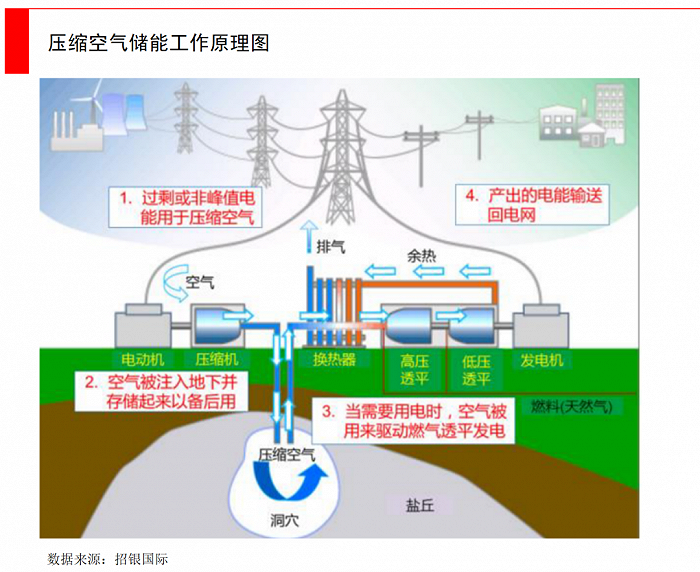 壓縮空氣儲(chǔ)能:目前體量還非常小,它的工作邏輯是在用電低谷期,把過(guò)剩電能將空氣壓縮至高壓,存到儲(chǔ)氣室中,也就是將電能轉(zhuǎn)化為空氣內(nèi)能儲(chǔ)存起來(lái)。當(dāng)需要用電時(shí),高壓空氣從儲(chǔ)氣室釋放進(jìn)入燃燒室,利用燃料燃燒加熱升溫后,驅(qū)動(dòng)燃?xì)馔钙桨l(fā)電。在實(shí)際應(yīng)用中,為了節(jié)約儲(chǔ)氣室的建設(shè)成本,經(jīng)常是去尋找礦洞來(lái)作為天然的儲(chǔ)氣室,這也會(huì)受制于地理結(jié)構(gòu)。壓縮空氣的能效比較低,只有65-75%。截至2021年底,壓縮空氣儲(chǔ)能在全球新型儲(chǔ)能裝機(jī)規(guī)模中,占比為2.3%,商業(yè)推廣目前比較少。