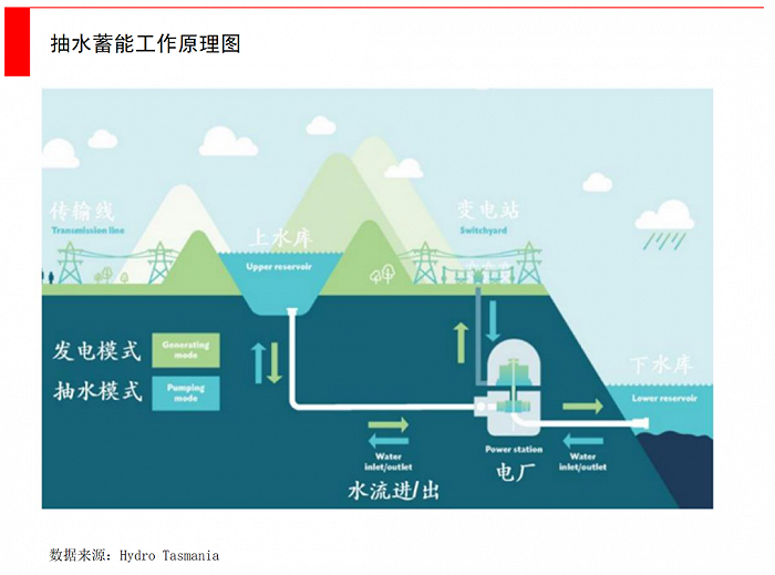 歷史最為悠久、技術(shù)最為成熟的儲(chǔ)能方式是抽水蓄能。它其實(shí)非常簡(jiǎn)單,就是把多余的電力輸入抽水機(jī)組,利用水壩的高低差,把水從低位抽到高位。當(dāng)需要用電時(shí),再開閘放水發(fā)電。它所能儲(chǔ)備的電量非常大。