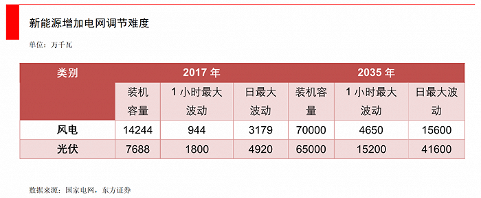 根據(jù)國(guó)家電網(wǎng)的測(cè)算,2035年前,風(fēng)、光裝機(jī)規(guī)模分別將達(dá)到7億、6.5億千瓦,全國(guó)風(fēng)電、太陽(yáng)能日最大波動(dòng)率預(yù)計(jì)分別達(dá)1.56億、4.16億千瓦,大大超出目前調(diào)節(jié)能力,迫切需要重新構(gòu)建調(diào)峰體系,以具備應(yīng)對(duì)新能源5億千瓦左右的日功率波動(dòng)的調(diào)節(jié)能力。