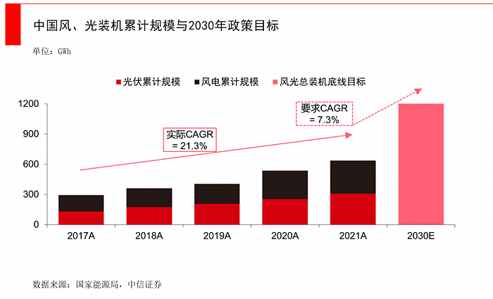 國(guó)內(nèi)儲(chǔ)能的大爆發(fā),來(lái)源于政策變化。在碳中和、提升能源自給率的大背景下,國(guó)家能源局在《關(guān)于2021年風(fēng)電、光伏發(fā)電開發(fā)建設(shè)有關(guān)事項(xiàng)的通知》中,計(jì)劃2030年風(fēng)電光伏裝機(jī)總?cè)萘繉⑦_(dá)到12億千瓦,而截至2020年底,風(fēng)光總量不過(guò)6.3億千瓦,這一目標(biāo)意味著在未來(lái)10年中,風(fēng)電與光伏要各新增3億千瓦。