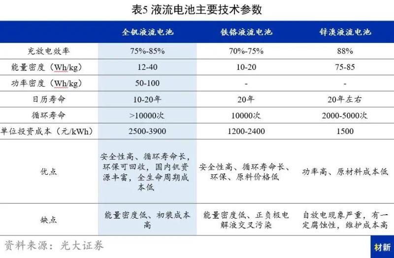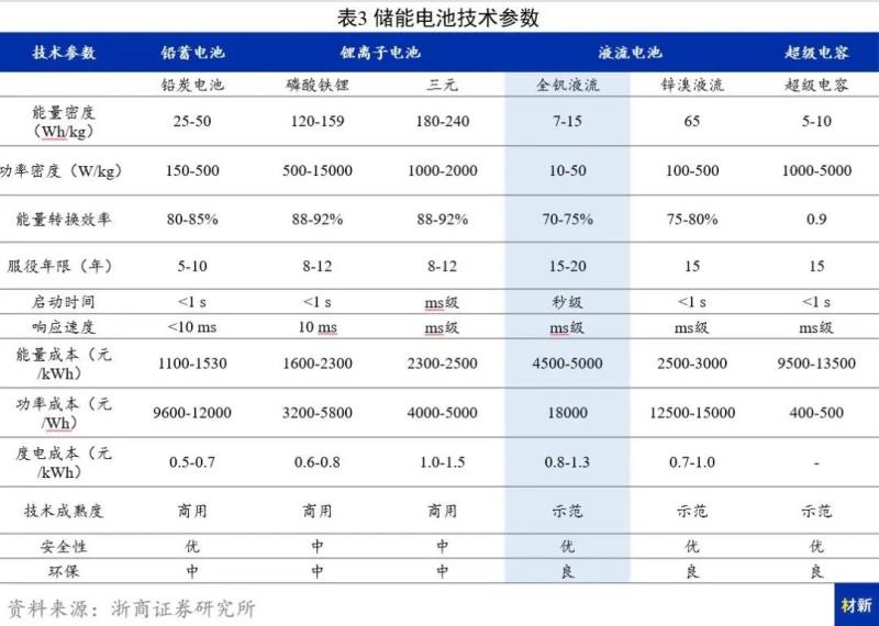 (3) 液流電池:液流電池具有使用壽命長、轉(zhuǎn)化效率高、支持過充過放、可獨立配置電池容量及功率、維護運營成本低、環(huán)保等優(yōu)點,但同時其目前也存在著能量密度低、初裝成本高等缺點。