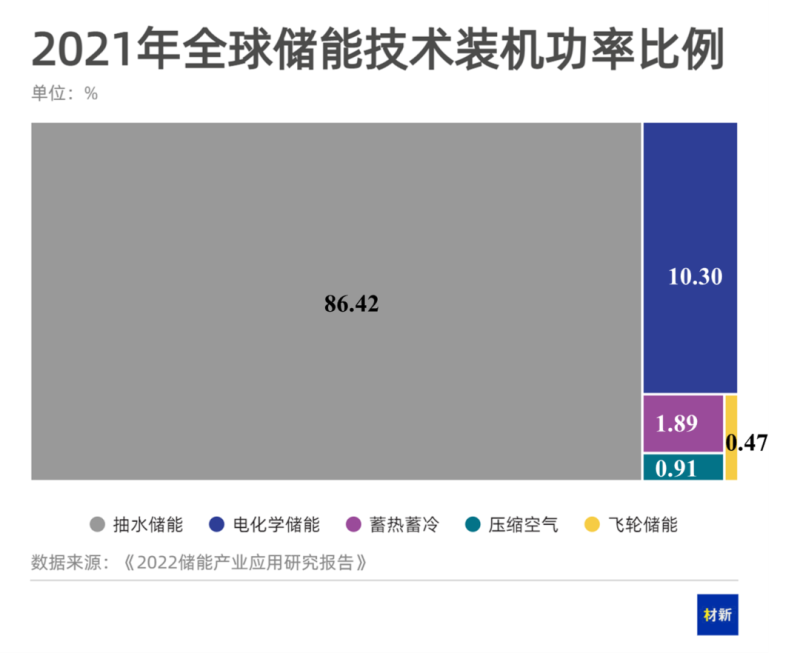 據(jù)《2022儲能產(chǎn)業(yè)應(yīng)用研究報告》,2021年全球儲能市場裝機功率205.3GW,中國儲能市場裝機功率43.44GW,位居全球第一。抽水儲能占據(jù)儲能市場大頭,全球與中國抽水儲能占比相當(dāng),約為86.5%。大型抽水儲能電站可提供低成本、可調(diào)度的電力,但同時具有場地限制、建設(shè)時間長及環(huán)境問題等發(fā)展制約因素。