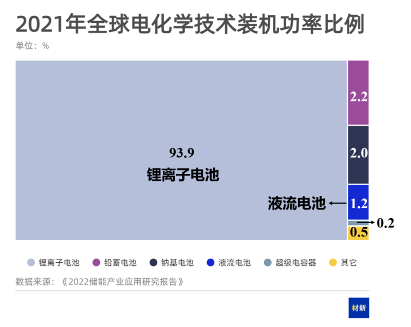 在電化學(xué)儲能市場中,鋰離子電池占據(jù)市場主導(dǎo)地位。鋰離子電池裝機規(guī)模全球及中國占比分別達到93.9%及91.0%。液流電池(主要為全釩液流電池)作為鋰離子電池的補充,其裝機規(guī)模在全球及中國市場占比僅為1.2%及2.9%。