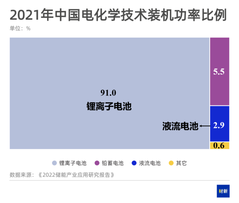 以釩電池為代表的液流電池,2019年裝機規(guī)模為20MW,2020年裝機規(guī)模達到100MW,2022年已有多家企業(yè)積極布局百兆瓦級釩電池工程,如大連融科、上海電氣、偉力得、中廣核、綠動中釩新能源等公司。據(jù)CNESA統(tǒng)計,2021年國內(nèi)釩電池在新型儲能領(lǐng)域的滲透率約為0.9%,未來發(fā)展空間巨大。
