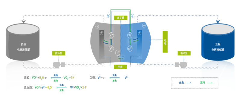 充放電過程中,主要是依靠電解液中的氫離子在離子膜上的定向移動形成電流回路。電堆內(nèi)部發(fā)生氧化還原反應(yīng),其化學(xué)反應(yīng)方程式為(正向為充電反應(yīng),逆向為放電反應(yīng)):