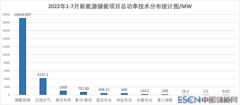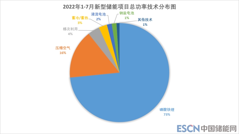 新型儲能項目依舊以電化學(xué)儲能項目為主,占比近80%,其中電化學(xué)儲能項目儲能技術(shù)絕大多數(shù)我磷酸鐵鋰儲能,占比達90%以上,是現(xiàn)在電化學(xué)儲能項目所采用的主要技術(shù)。此外,壓縮空氣項目的潛能逐漸體現(xiàn),2022年1-7月規(guī)劃中、建設(shè)中的壓縮空氣項目裝機功率總量占比16%,共4.2GW,我國發(fā)展壓縮空氣儲能還具有巨大潛力。