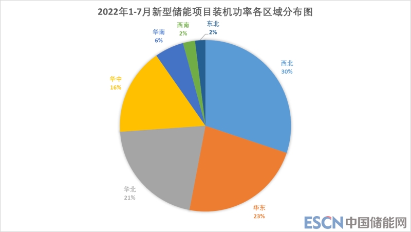 由各區(qū)域新能源項目總裝機功率統(tǒng)計圖可以看出,2022年1-7月新能源裝機主要集中在西北、華北、華中和華東地區(qū),分別占比30%、23%、21%和16%.