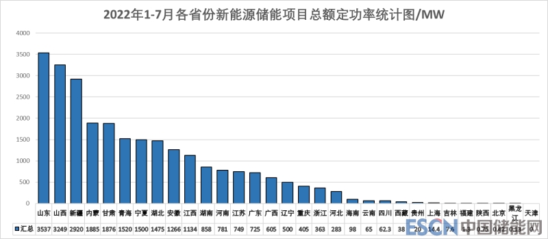 由各省份新能源項目額定功率分布圖可以看出,2022年1-7月新能源儲能項目額定裝機功率Top10省份為山東、山西、新疆、內(nèi)蒙、甘肅、青海、寧夏、湖北、安徽、江西,其中山東、山西和新疆三個省份裝機功率遙遙領(lǐng)先,總占比近38%。