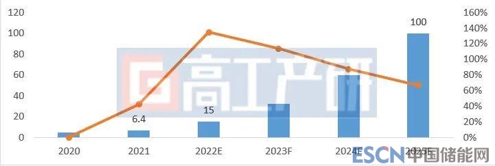 2020-2025年全球戶用家儲產(chǎn)品新增裝機(jī)規(guī)模預(yù)測(GWh,%)