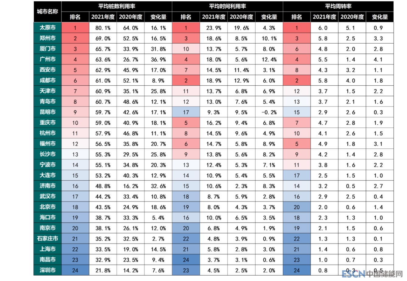 24座城市公用樁的平均樁數(shù)利用率、平均時間利用率、平均周轉(zhuǎn)率在絕對值上分別提高16.9%、5.2%和1.6,相對增長率分別高達47.5%、75%和84%。廈門、廣州、福州、長沙、濟南等城市的公用樁效能提升幅度較大,???、石家莊、南昌、深圳等城市的公用樁效能提升幅度較小。