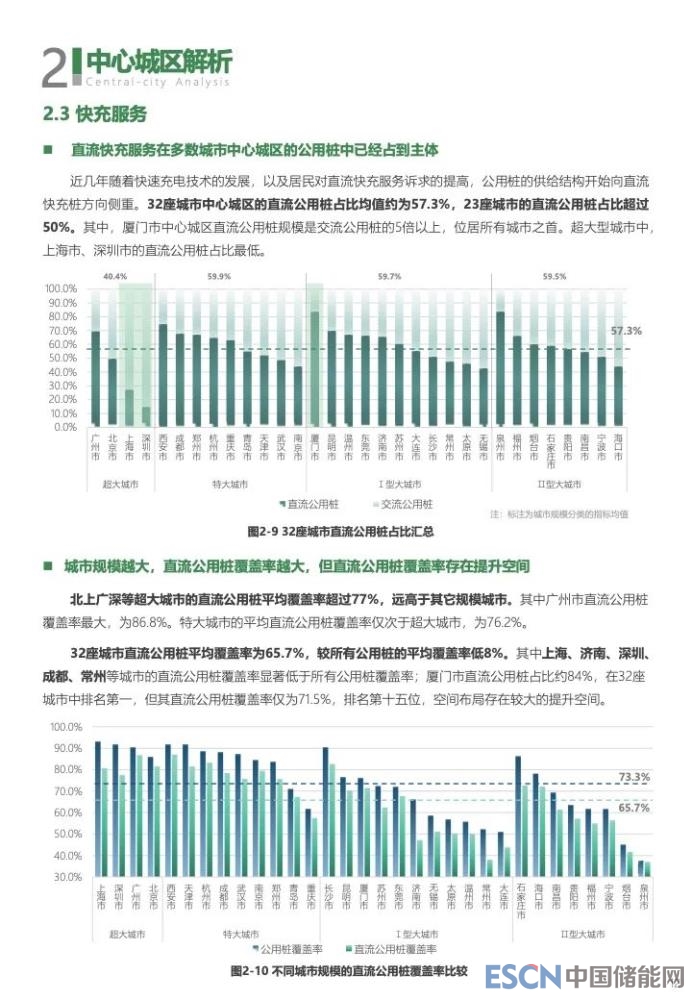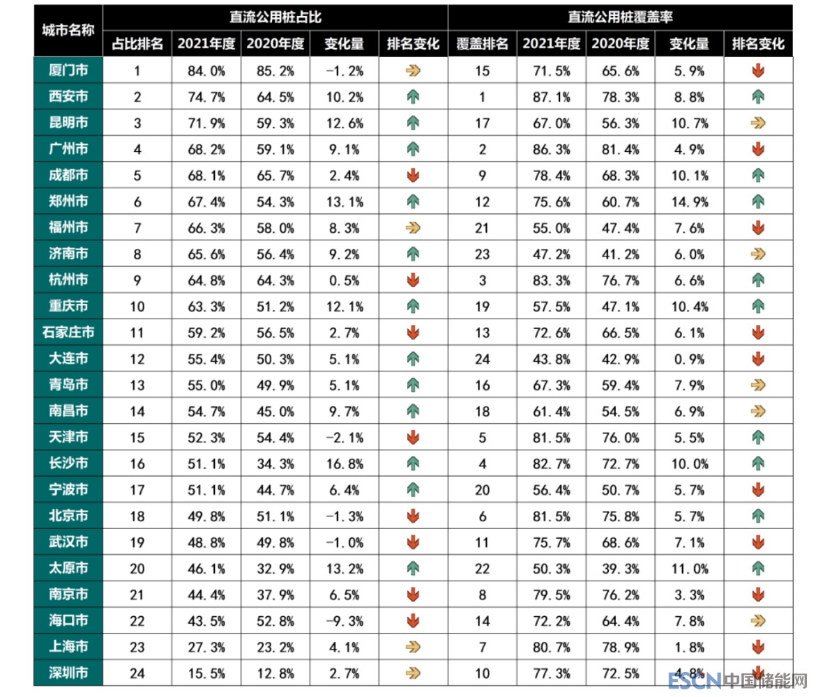 在32座城市的所有公樁中,直流公用樁占比均值約為57.3%,其中,23座城市的直流公用樁占比超過50%,直流快充服務(wù)在多數(shù)城市中心城區(qū)的公用樁中已經(jīng)占到主體。與所有公樁相比,24座城市的直流公用樁覆蓋率平均增長約7.1%,其中23座城市的直流公用樁覆蓋率增幅高于公用樁整體覆蓋率增幅,鄭州、太原、昆明、重慶、成都、長沙等城市直流公用樁覆蓋率較2020年度增加超過10%。