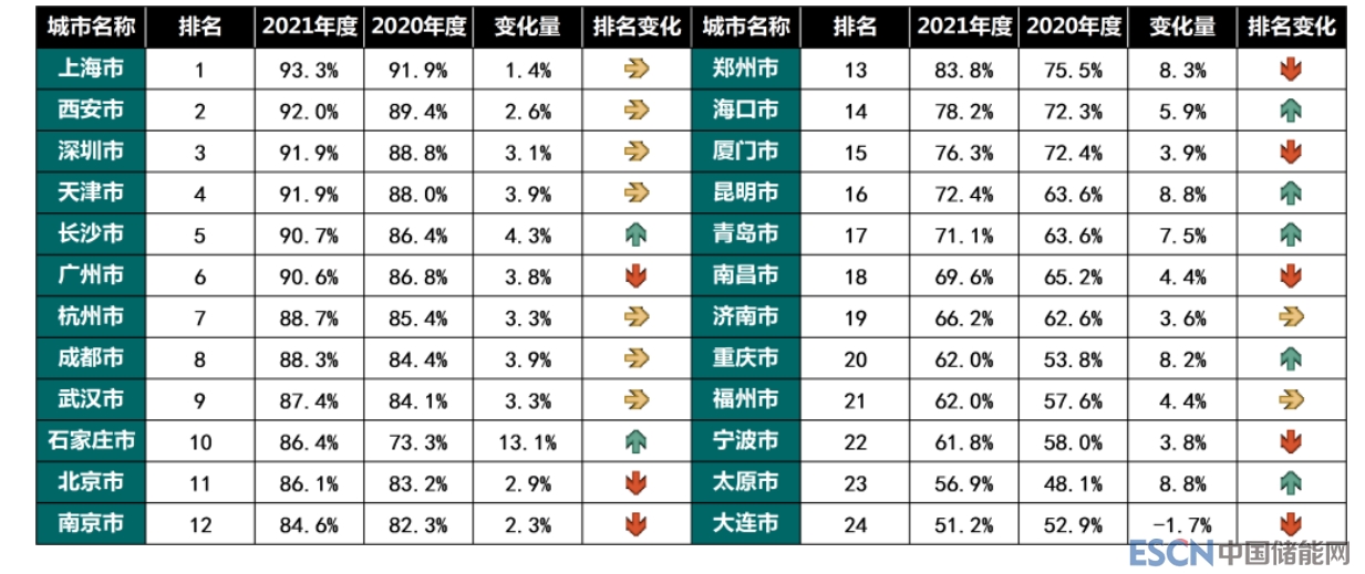 32座城市中心城區(qū)公用樁的平均覆蓋率為73.3%。上海、深圳、西安、天津、廣州和長沙等6座城市中心城區(qū)公用樁覆蓋率超過90%,煙臺、大連、常州、泉州等7座城市的公用樁覆蓋率偏低,小于60%。與2020年相比,24座城市2021年的公用樁覆蓋率比2020年提高4.7%,相對變化率遠小于公用樁密度,體現(xiàn)出穩(wěn)步增加的特點。