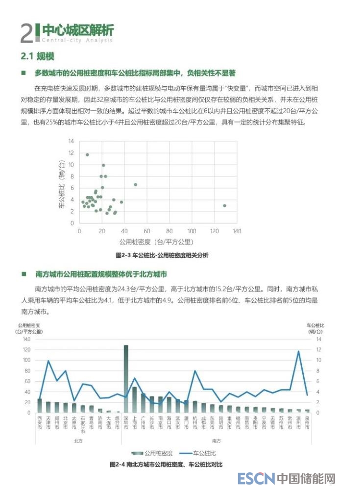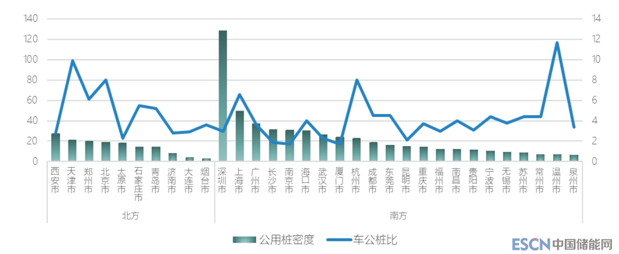 32座城市公用樁的平均密度超過21臺/平方公里,其中深圳、上海、廣州、長沙、南京和海口等城市的公用樁密度超過30臺/平方公里。南方城市的平均公用樁密度為24.3臺/平方公里,高于北方城市的15.2臺/平方公里。同時,南方城市私人乘用車輛的平均車公樁比為4.1,低于北方城市的4.9。公用樁密度排名前6位、車公樁比排名前5位的均是南方城市。
