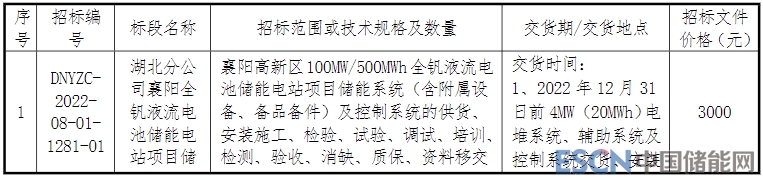 中國(guó)儲(chǔ)能網(wǎng)訊:8月26日,國(guó)家電力投資集團(tuán)有限公司發(fā)布二〇二二年度第四十八批集中招標(biāo)招標(biāo)公告。據(jù)了解,招標(biāo)內(nèi)容包含湖北分公司襄陽(yáng)全釩液流電池儲(chǔ)能電站項(xiàng)目?jī)?chǔ)能系統(tǒng)及控制系統(tǒng)設(shè)備、電解液采購(gòu)。