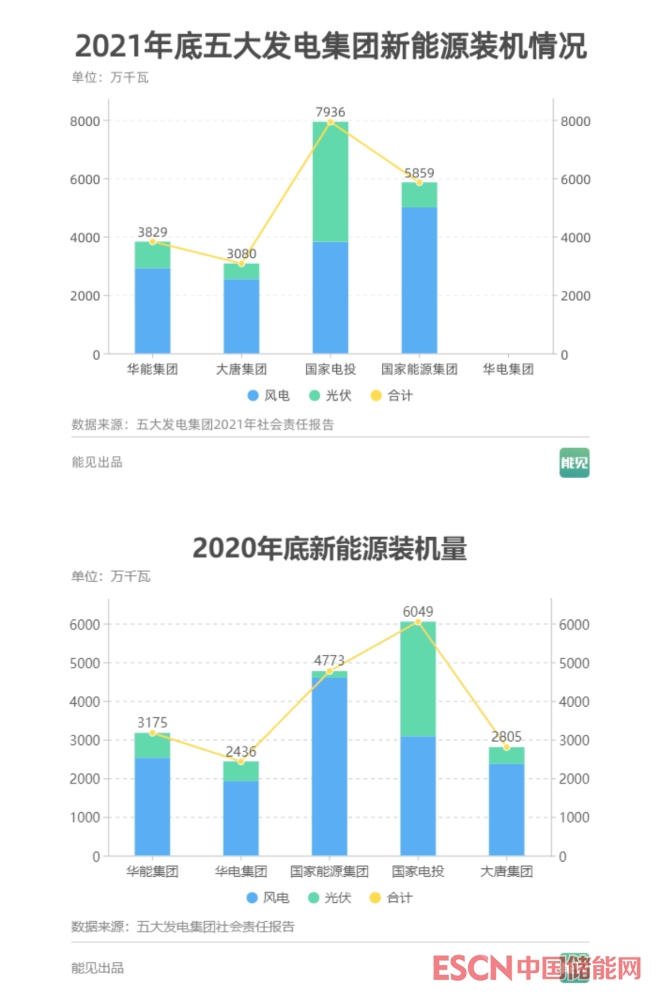 第一,五大發(fā)電集團風(fēng)電、光伏合計新增裝機量普遍較2020年有了大幅提升。