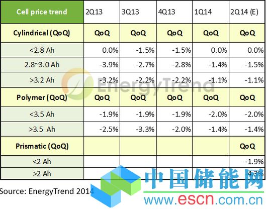 高分子電池:由于第二季新機(jī)種出貨量不高,高分子電池價(jià)格依然下滑。盡管中國生產(chǎn)電池芯供給量增加,但因品質(zhì)因素大多停留在山寨與白牌的智能手機(jī)與平板,對于一線品牌的高分子電池價(jià)格影響不大,第二季價(jià)格跌幅約在 1.5-2%。